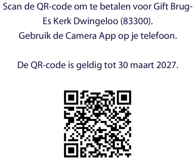 Het werk van de Brug-Es Kerk is afhankelijk van giften. Iedereen is welkom in de kerk en iedereen mag – zonder betaling – een beroep doen op onze hulp. Dat geldt ook als je geen lid bent, en ook als je financieel geen bijdrage kunt leveren. Maar om ons werk te kunnen doen, zijn financiële giften meer dan welkom. Ook voor de kerkzijn het best spannende tijden om de begroting rond te krijgen. Ben jij lid van de kerk? Dan word je elk jaar uitgenodigd om mee te doen aan “Actie Kerkbalans”. Actie Kerkbalans helpt ons om de kerkdiensten in stand te houden, de predikant in zijn levensonderhoud te voorzien, en de dagelijkse activiteiten van de kerk te bekostigen. Ook als je geen lid bent, maar het werk van de Brug-Es Kerk een warm hart toedraagt, zijn je giften van harte welkom. Je kunt je gift overmaken naar: NL87 RABO 0315 5552 03 t.n.v. Gereformeerde Kerk Dwingeloo. De Brug-Es Kerk heeft een ANBI status, waardoor giften aftrekbaar kunnen zijn voor de Belastingdienst.